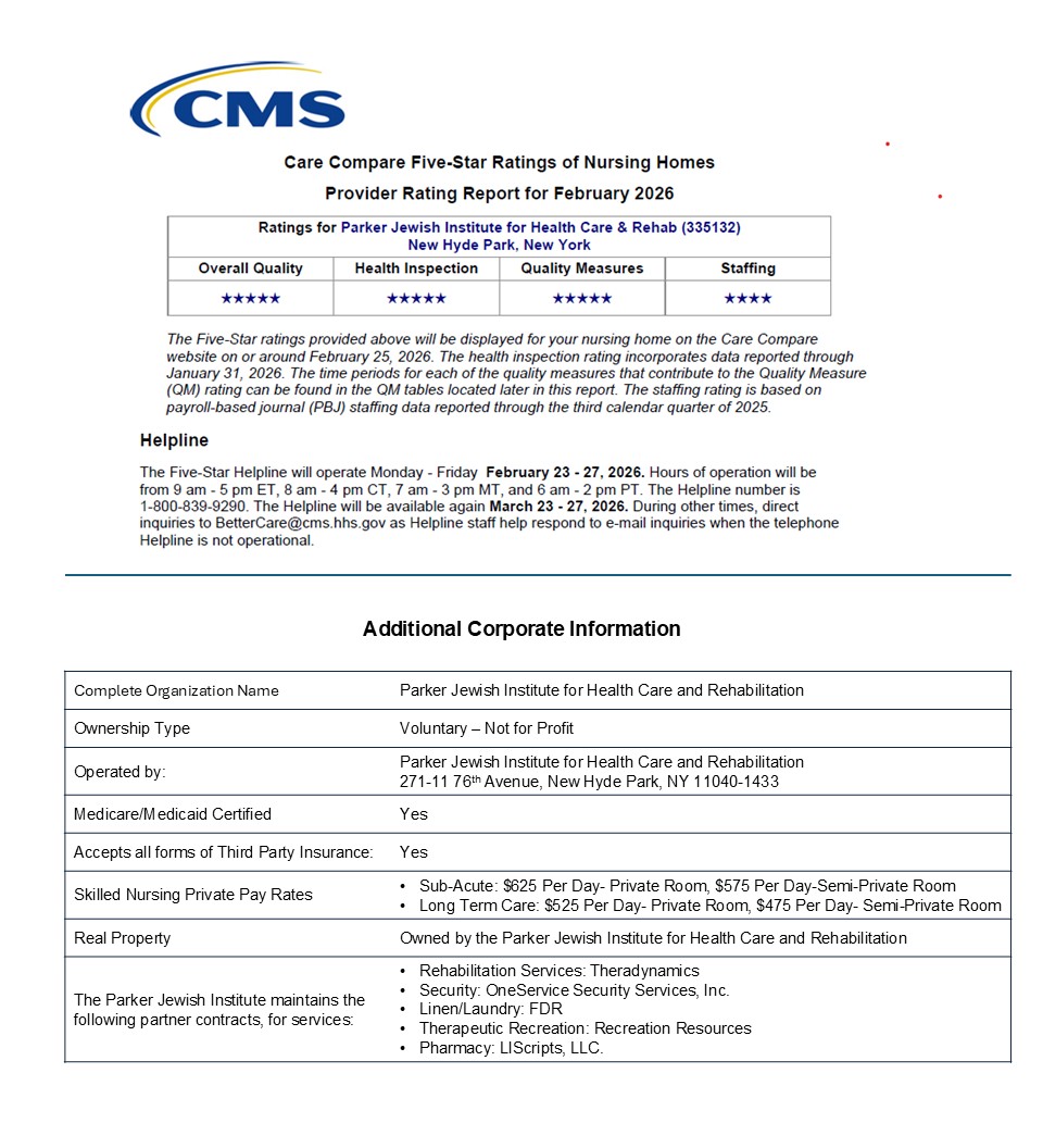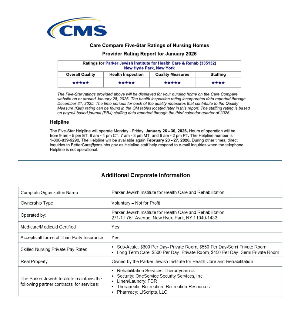 Parker Jewish Institute for Health Care and Rehabilitation's mission is to provide, with compassion and dedication, superior quality health care and rehabilitation for adults. Through continual improvement of Parker's programs and services, it is a leader in health care delivery and education.