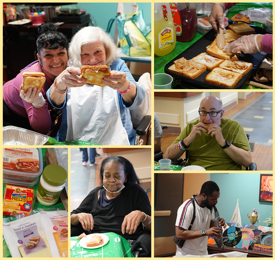 On Wednesday, April 15, 2026, patients and residents at the Parker Jewish Institute gathered for a grilled cheese social. Freshly made, participants selected their cheese of choice - American, Swiss or cheddar, and were given the option of adding ham or turkey. While the sandwiches were being grilled to perfection, residents enjoyed live music and a refreshing drink of watermelon juice and lemonade. As the aroma of melting butter and cheese filled the air, the party grew larger. This grilled cheese social was truly a fun and tasty treat for all!